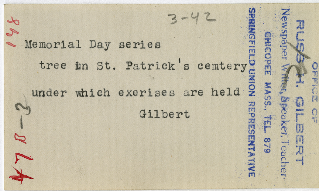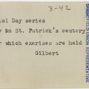 Gilbert, Russ H., “Memorial Day at St. Patrick's Cemetery,” Chicopee Archives Online, accessed March 6, 2026, https://www.chicopeepubliclibrary.org/archives/items/show/4938.