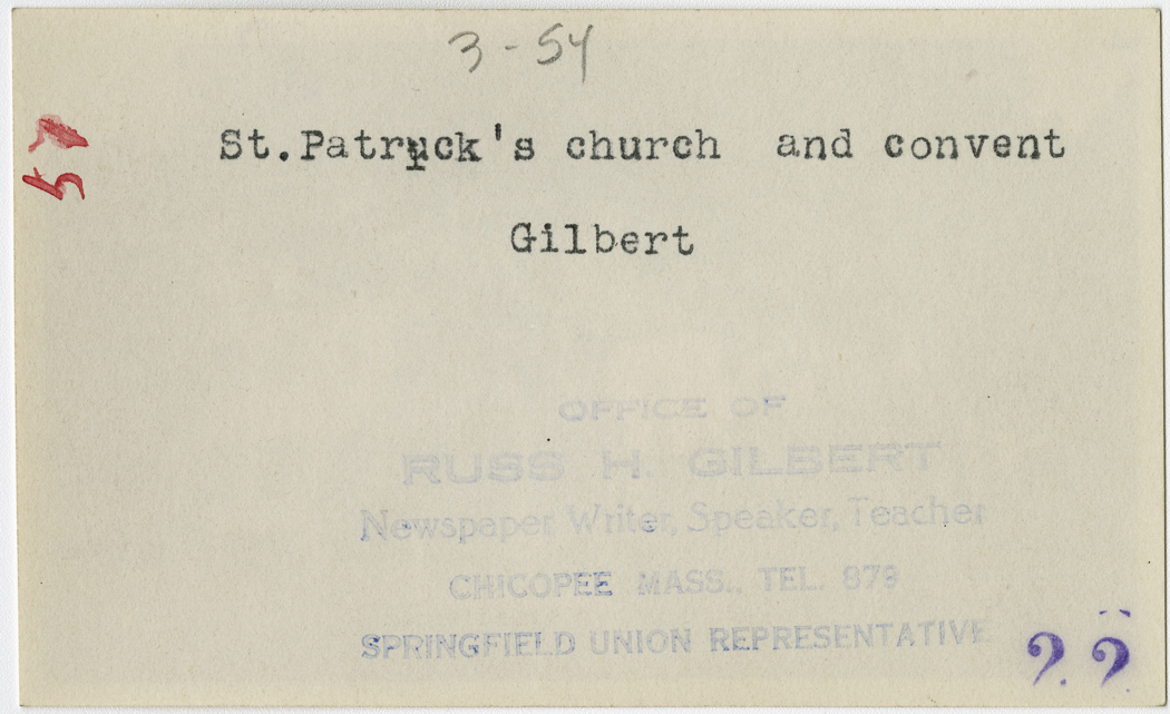 Gilbert, Russ H., “St. Patrick's Church and Convent,” Chicopee Archives Online, accessed March 6, 2026, https://www.chicopeepubliclibrary.org/archives/items/show/4950.