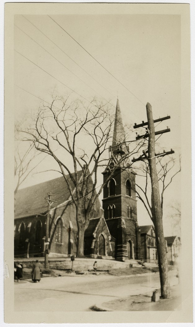 Third Congregational Church from across Springfield Street showing the steeple and telephone poles