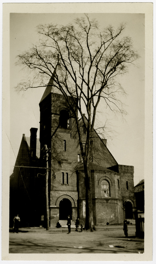 Front view of the Central Baptist Church building that was being used at the time as a moving picture house