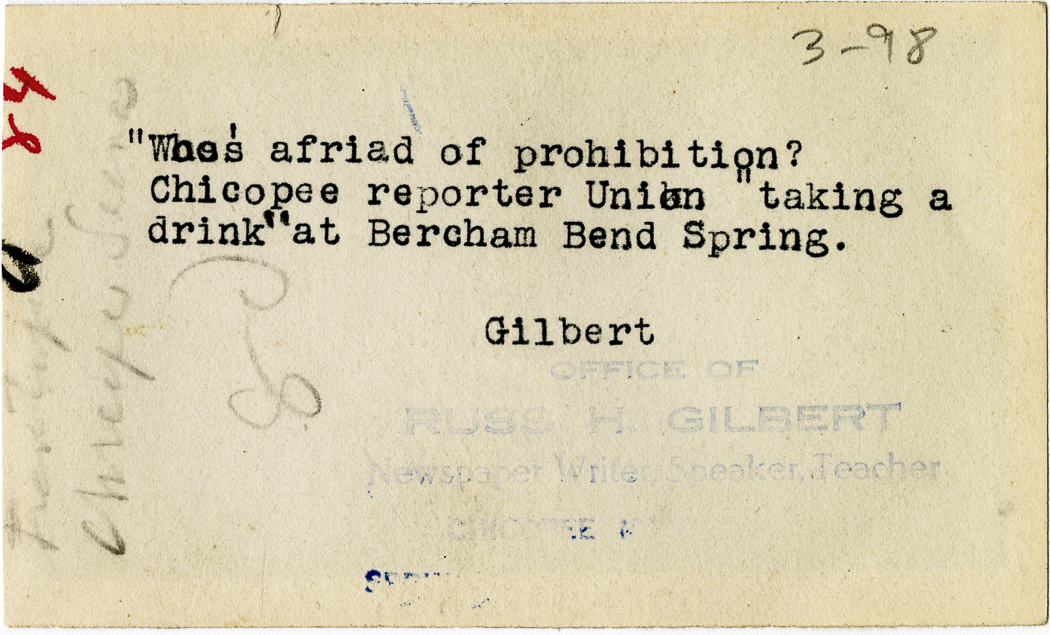 Gilbert, Russ H., “Russ Gilbert at Bercham Bend Spring,” Chicopee Archives Online, accessed March 6, 2026, https://www.chicopeepubliclibrary.org/archives/items/show/4994.