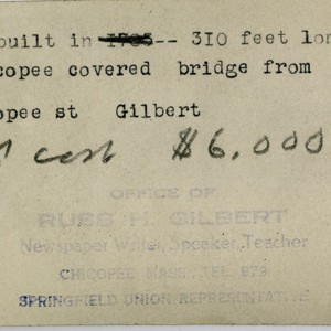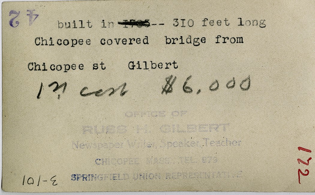 Gilbert, Russ H., “Covered Bridge over the Chicopee River with Ames Manufacturing,” Chicopee Archives Online, accessed March 6, 2026, https://www.chicopeepubliclibrary.org/archives/items/show/4997.