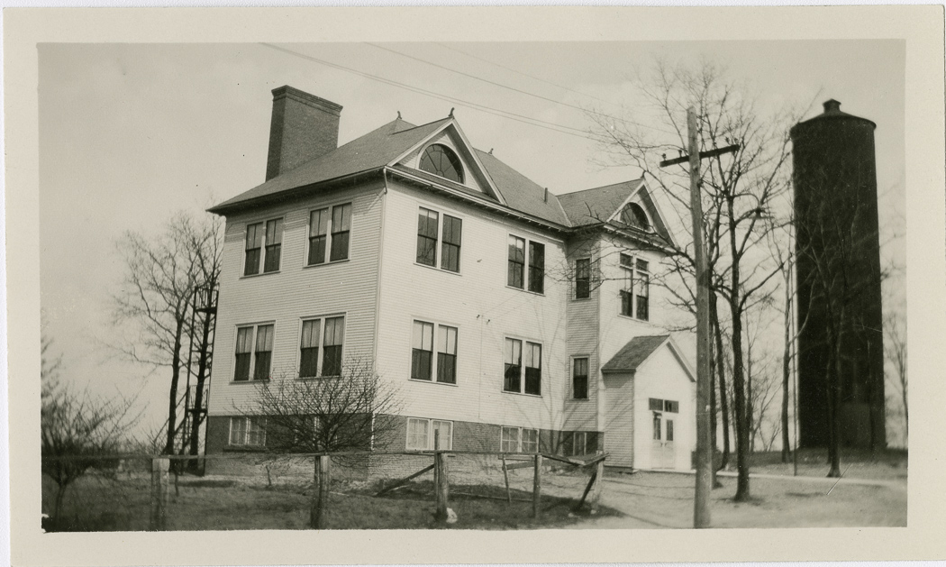 Left side and front view of the Royal School in Fairview with the standpipe in the background