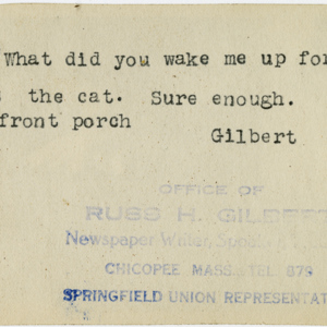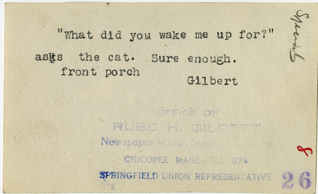 Gilbert, Russ H., “White Cat on Porch,” Chicopee Archives Online, accessed March 6, 2026, https://www.chicopeepubliclibrary.org/archives/items/show/5002.