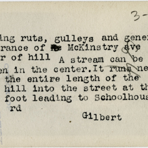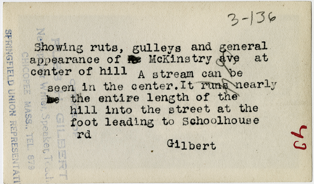 Gilbert, Russ H., “Ruts and Gulleys near McKinstry Avenue,” Chicopee Archives Online, accessed March 6, 2026, https://www.chicopeepubliclibrary.org/archives/items/show/5032.