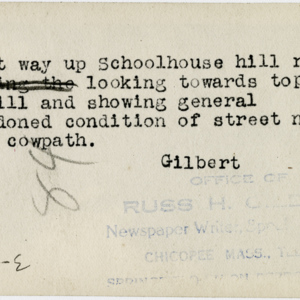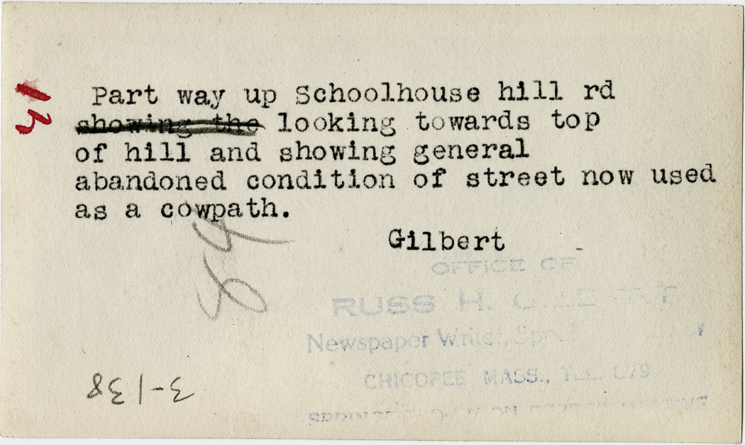 Gilbert, Russ H., “Schoolhouse Hill Road Cow path,” Chicopee Archives Online, accessed March 6, 2026, https://www.chicopeepubliclibrary.org/archives/items/show/5034.