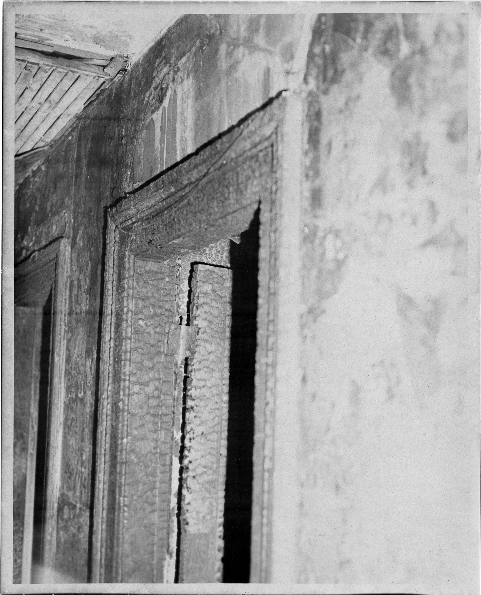 Interior hallway door in Market Square Hotel after fire on June 3, 1976 showing charring of door and wall
