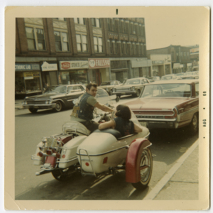 Pat and her husband-to-be Armond on East Main Street, Chicopee Falls, with a motorcycle and sidecar