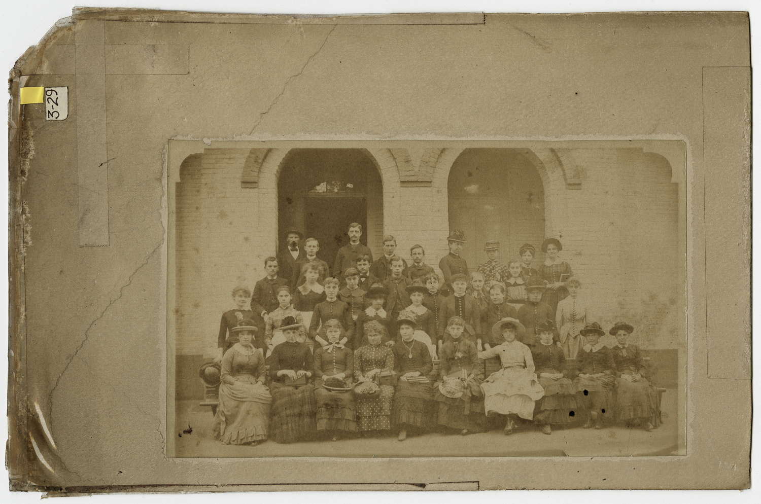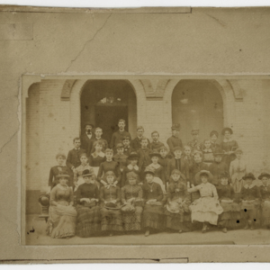 Group Photo of Chicopee Falls High School - Class of 1884, in front of the school building on Church Street, Chicopee Falls, MA, including Row 1: Alice McFarlain, Sadie Hawyard, Florence Fay, Ruby Rich, Nellie Cavenaugh, Minnie Russell, Elsie Newell, Nell Houghton, Lydia Graves, Effie Blake