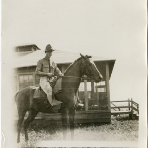 Officer mounted on a horse, base bulding in the background - Camp MacArthur - Waco, Texas - World War I