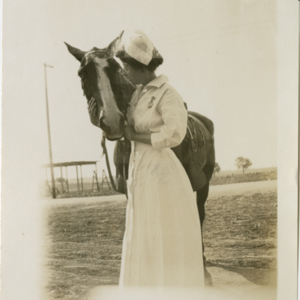 Nurse Linda C. Baker (?), creator of the Collection, with a horse (Boy?) - Camp MacArthur - Waco, Texas - World War I