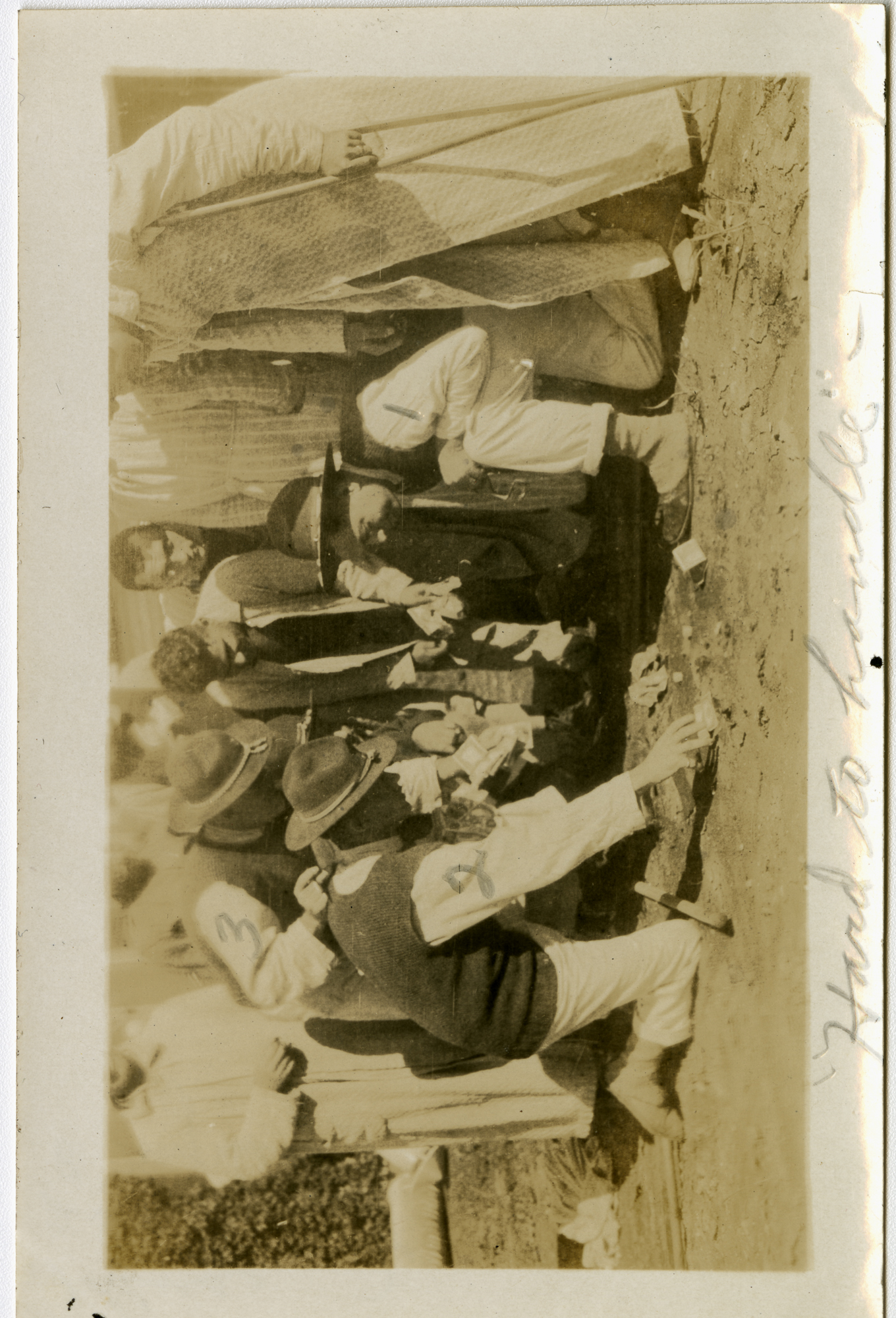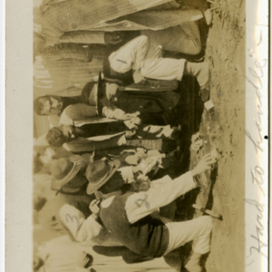 "Hard to Handle" - 4 patients (3 with military uniform caps) identified with numbers in image and names on the back as "1-Gus, 2-Issac, 3-myself (Lt. Heer?)" playing Craps, with 6 other patients gathered around observing - Camp MacArthur - Waco, Texas - World War I