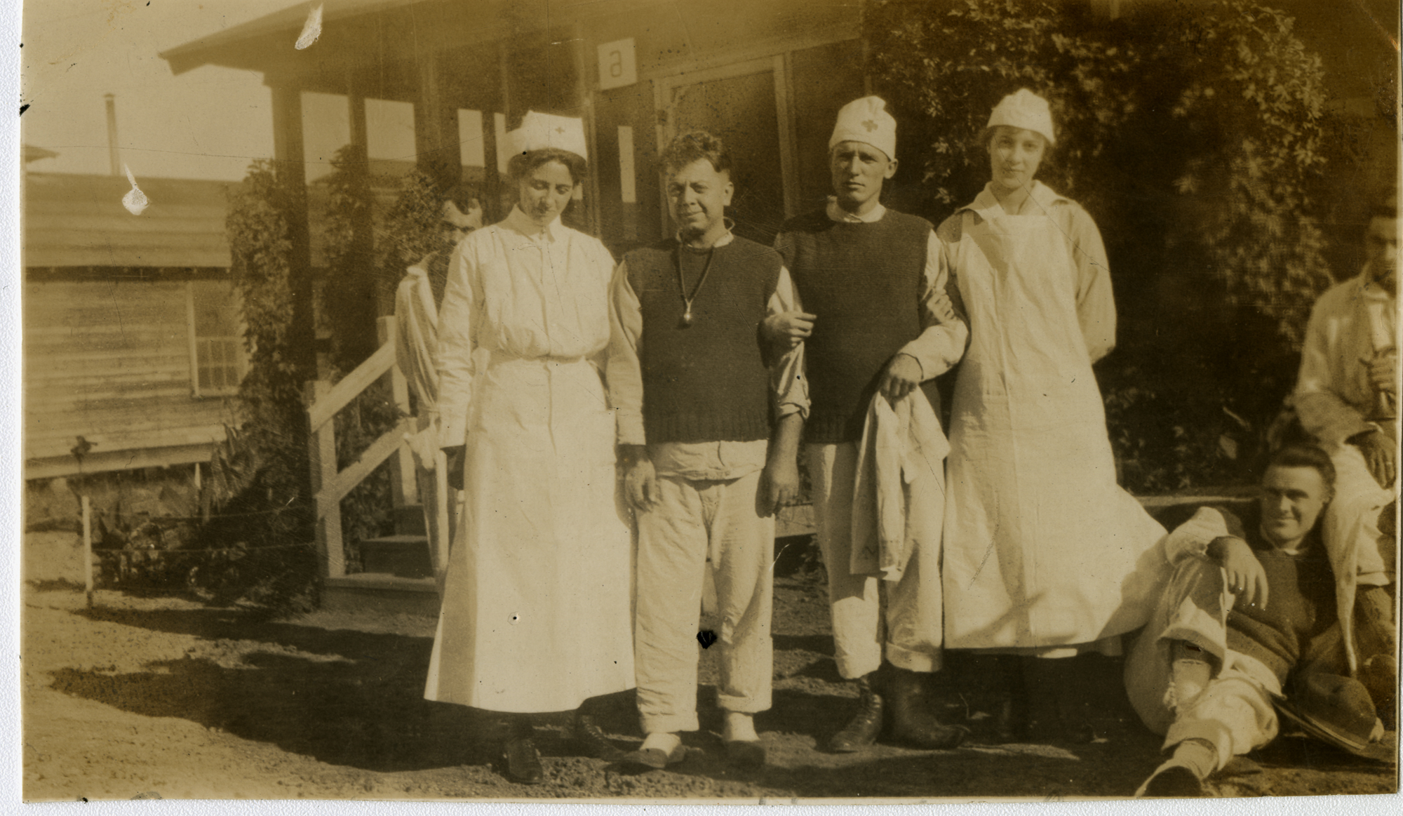 Nurse Linda C. Baker (?) - creator of the scrapbook- with 1 nurse and 5 patients, outside Hospital Building 6 - Camp MacArthur - Waco, Texas - World War 1