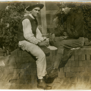 1 man in partial miliatry uniform, 1 man in military uniform, sitting on a pile of bricks outside a base building, "Ernest H. Johnson, Parkville M(issouri?)" - Camp MacArthur - Waco, Texas - World War I