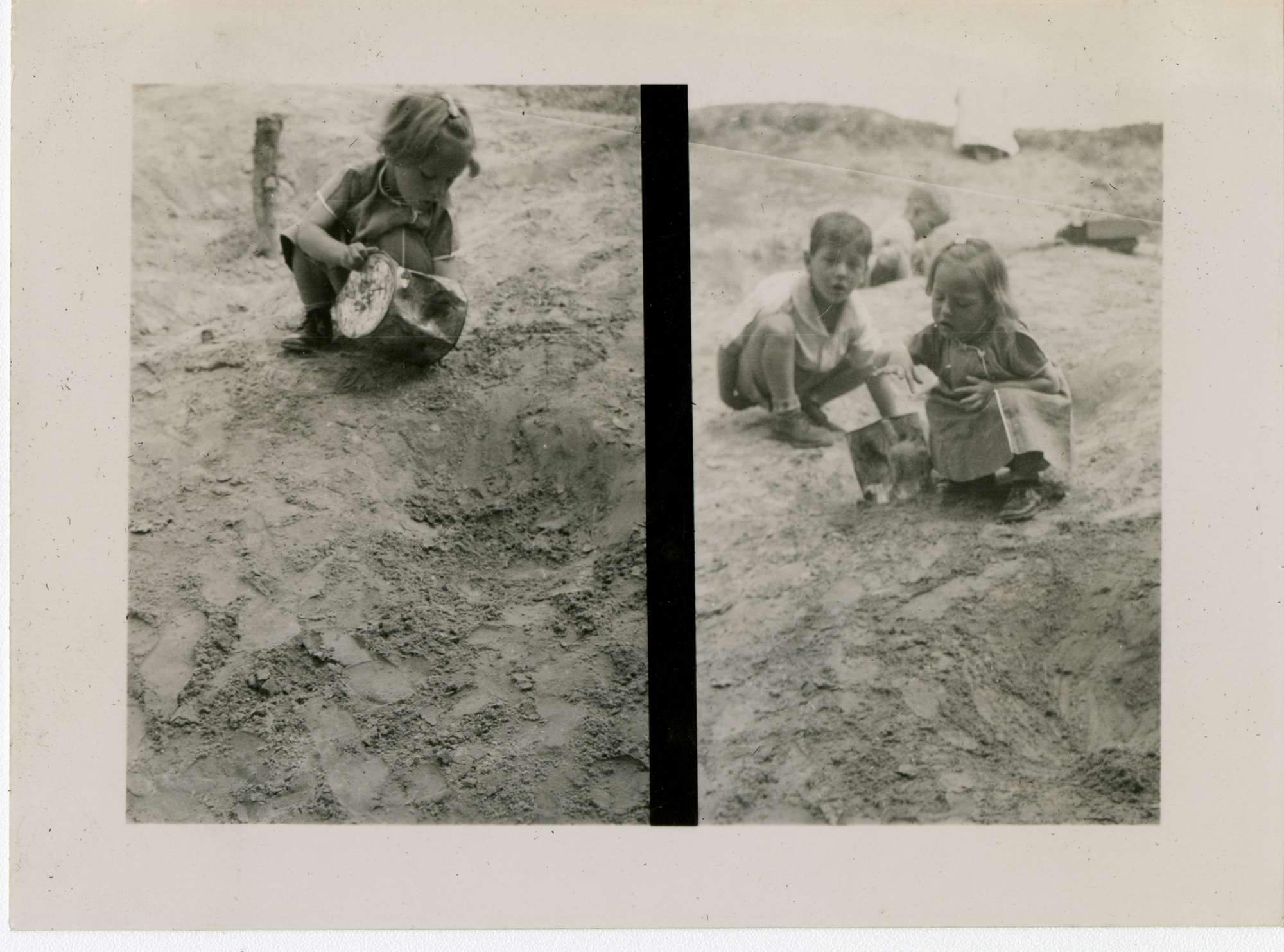 two photos: one of Emily Mika digging in the sand, and one of Emily & Walter Mika digging in the sand with 1 boy in the background