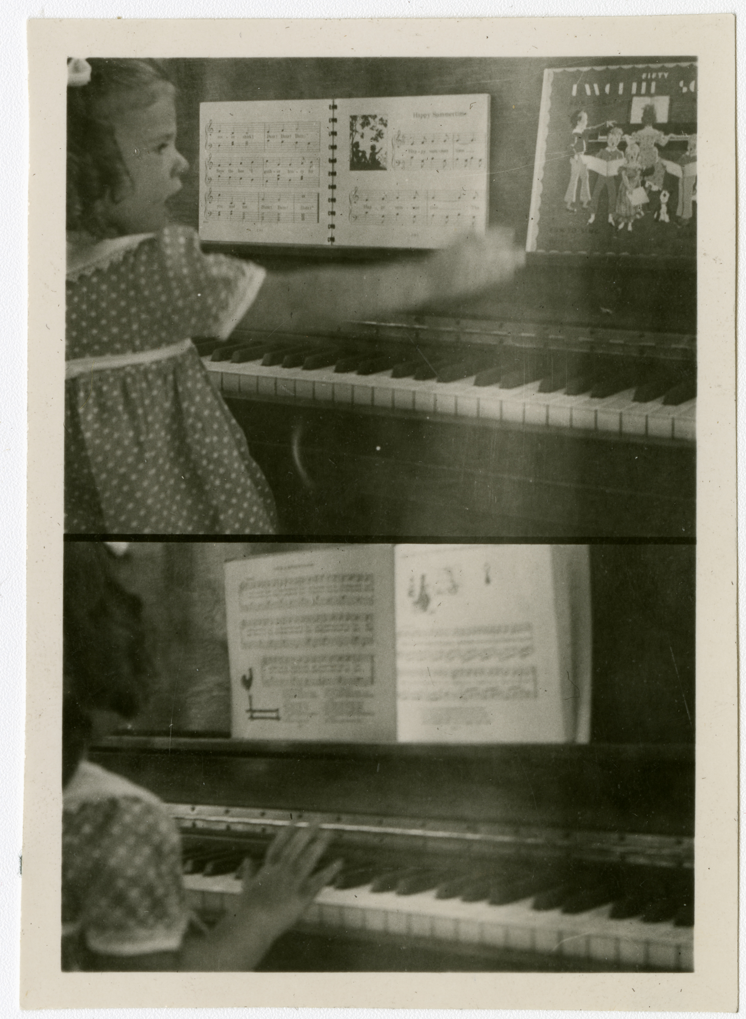 two photos of a girl at the piano