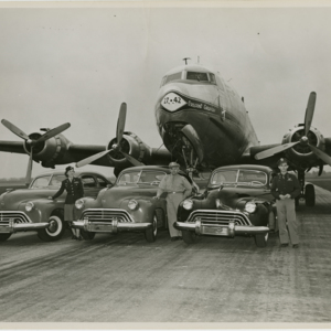 a member of Women's Army Corps and two members of the U.S. Air Force Reserve on the tarmac at Westover ARB with three cars and a Crescent Caravan transport plane in the background - "Not For Publication - Credit Line Must Read 'Official Photo U.S.A.A.F. Westover Field Mass.'"