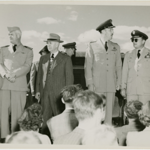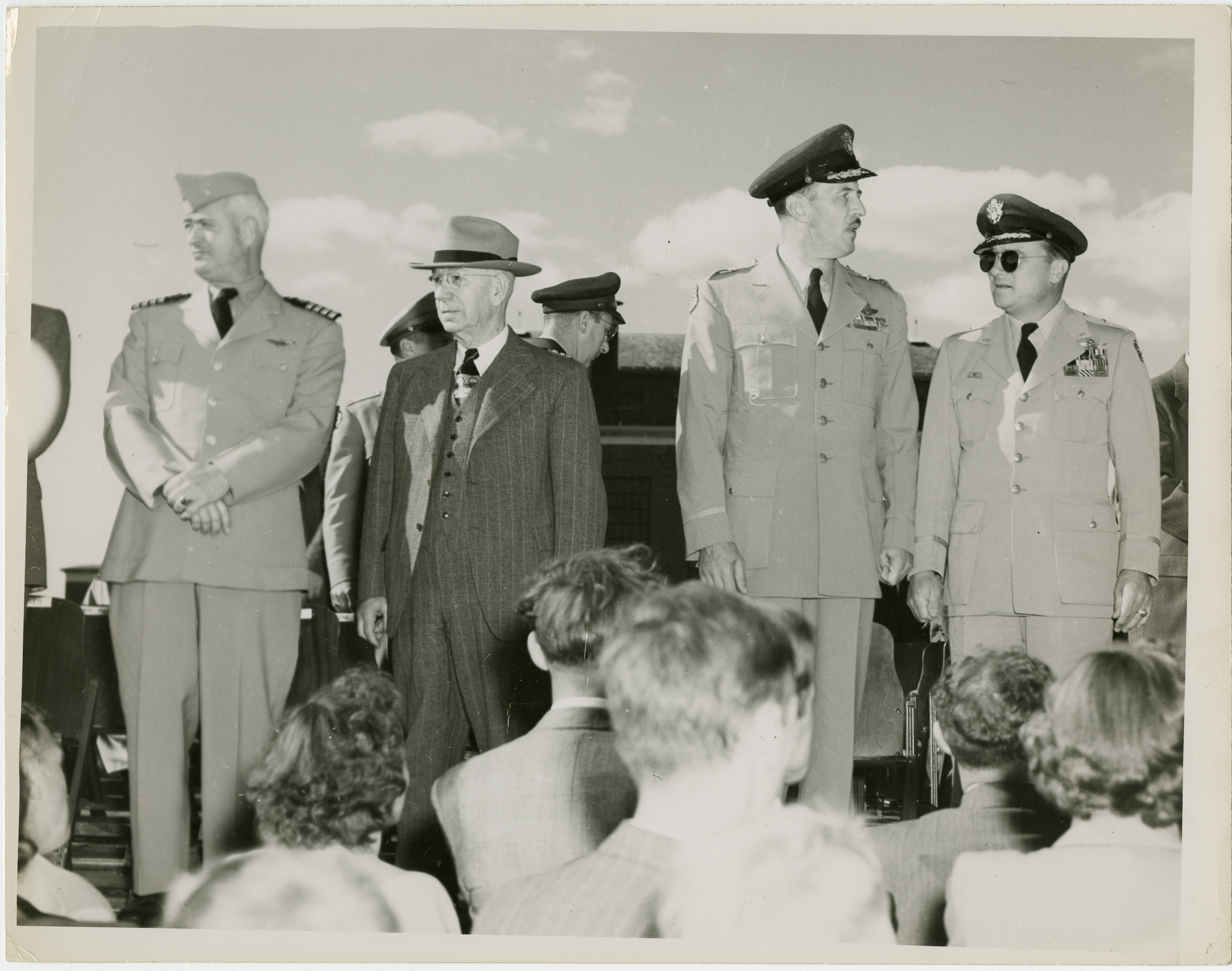 Viewing stand at Westover ARB Field, 5 officers, another dignitary, together with communitiy members - "Official Air Force Photograph, 1600th Air Transport Wing, Westover Air Force Base, Mass."