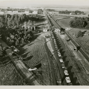 The road to Westover ARB lined with cars on community day - seen from the air - "Official Air Force Photograph, 1600th Air Transport Wing, Westover Air Force Base, Mass."