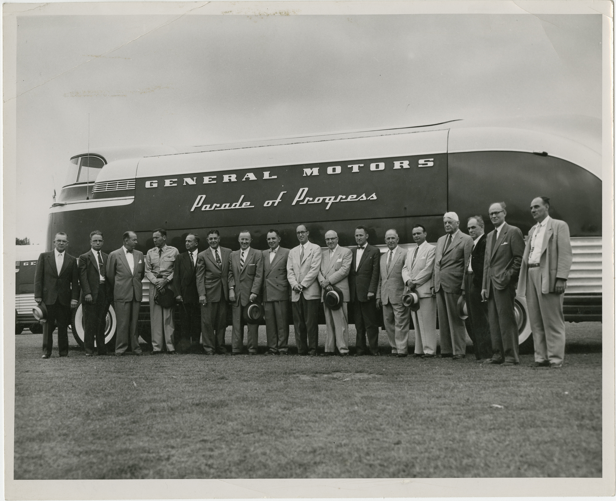 Anthony J. Stonina stands (fifth from left) with 16 other unidentified men beside the General Motors Parade of Progress bus