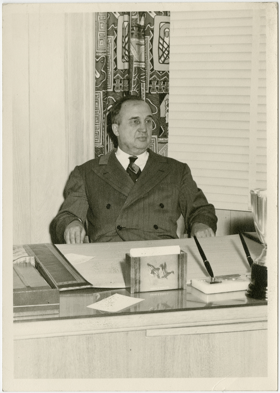 Anthony J. Stonina sits behind his desk - flying ducks desk set and trophy