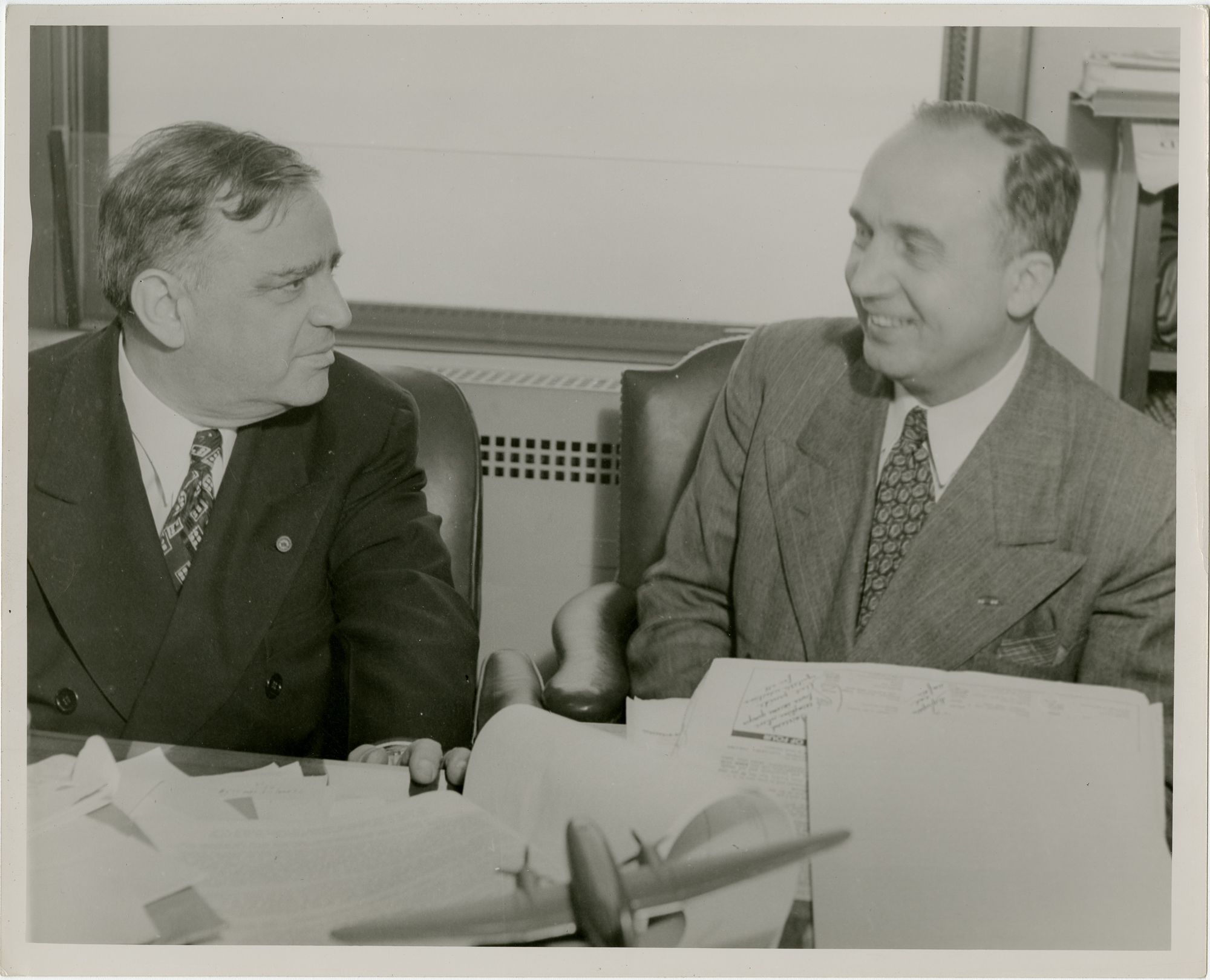 Anthony J. Stonina meets with an unidentified man. A large pile of documents is on the table in front of them.