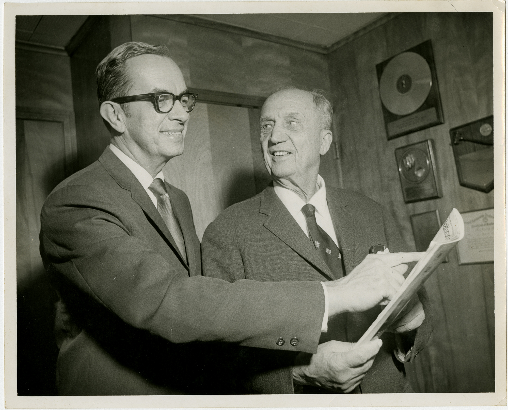 Anthony J. Stonina, recognized for a "Half-Century in Buisness" with unidentified man - Back of photograph says "Sun Rep 3 col cut Ret to Chamber "Half Century in Business Doesn't Stop-"