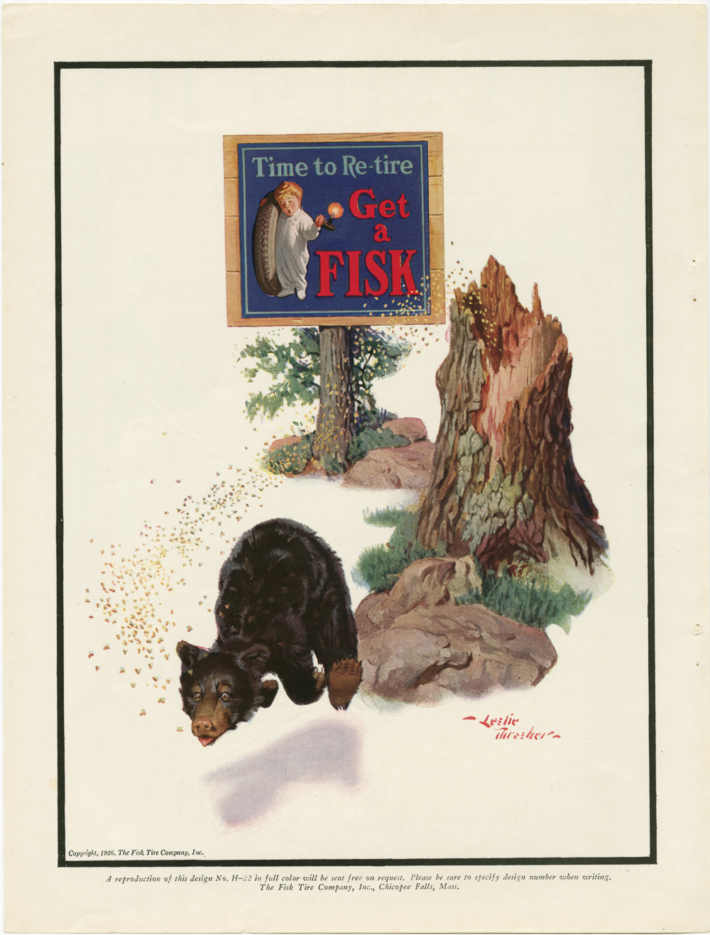 Charles Leslie Thrasher (1889 - 1936), “Fisk Tire Company Print Ad - Brown Bear running from Swarm of Bees,” Chicopee Archives Online, accessed March 5, 2026, https://www.chicopeepubliclibrary.org/archives/items/show/5457.