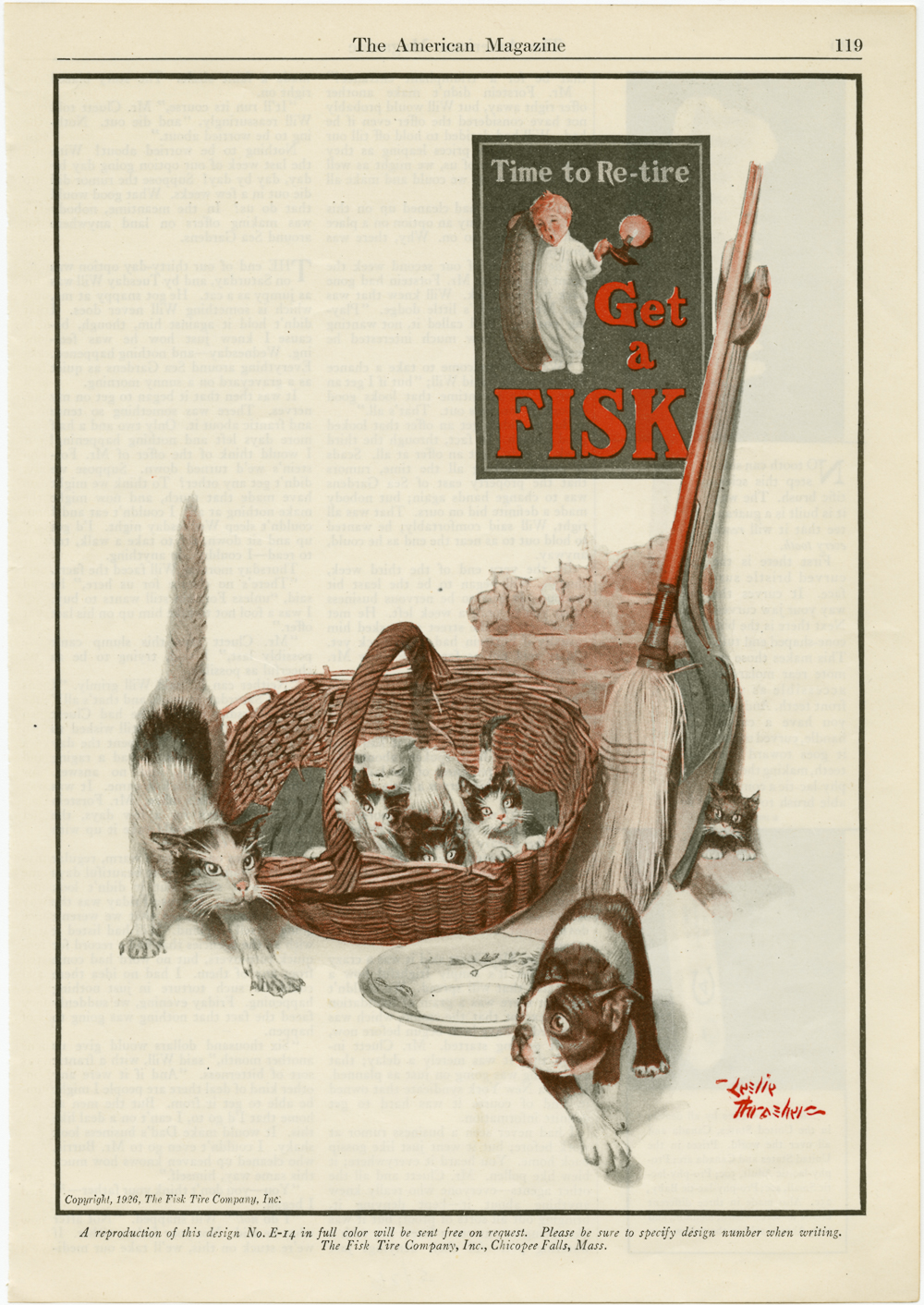 Fisk Tire Company print ad depicting a small black and white Boston Terrier moving away from a basket full of kittens and very angry mother cat. There is an empty bowl near the basket that the Terrier is also slinking away from. There are four kittens in the basket with looks that range from fear to curiosity. The kittens are either all white or are black and white in color. The mother cat is at attention on the left side of the basket with a fierce look in her eye and her tail is straight and puffed up. There is a small scared black kitten with white paws and nose hiding behind a broom and a shovel. The broom and shovel are leaning against a brick wall and a poster hangs near the handles. On the poster is the Fisk Tire logo and boy. The poster says "Time to Retire. Get a Fisk."