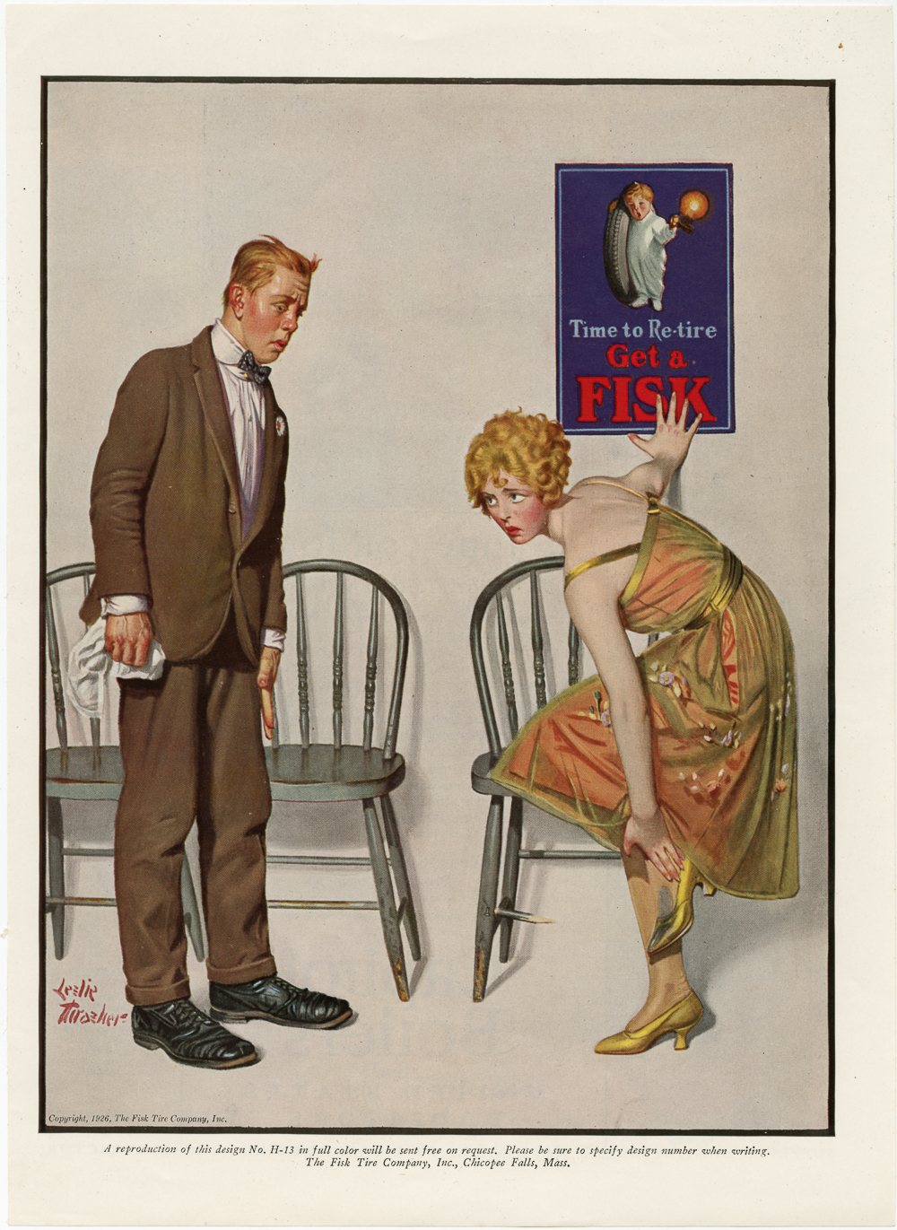 Fisk Tire Company print ad showing a young man and a young woman near a line of chairs against a white wall. The man is looking at the woman with sweat on his forehead and a look of concern and fear. The woman is holding her left foot and using her right arm to lean against the wall. There is large dirt smudge going from the top of the woman's ankle and down to the middle of her foot. There is a look of pain and dismay on her face. A Fisk Tire Boy poster, with the "Time to Re-tire" logo, hangs on the wall where the woman has her hand.