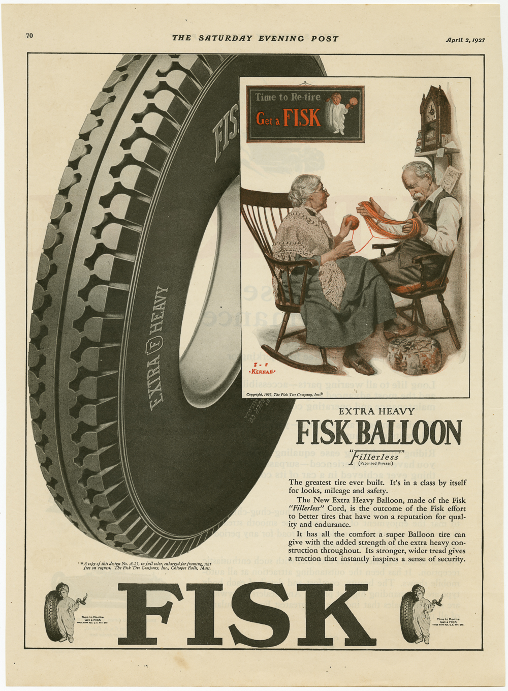 Fisk Tire Company print ad reprinting of one ad within another. Larger ad concentrates on the Extra Heavy Fisk Balloon Tire with an image of the tire and text about its safety. The insert of the earlier ad shows an older couple sitting together balling yarn. The older woman, on the left, is wrapping the yarn into a ball while the older man spreads out his hands and keeps the yarn from knotting. The older man's head is slumped as if he has fallen asleep. A small clock on a shelf above the man's head reads 9:00 p.m. and the Fisk "Time to Retire" sign hangs on the wall between the couple.