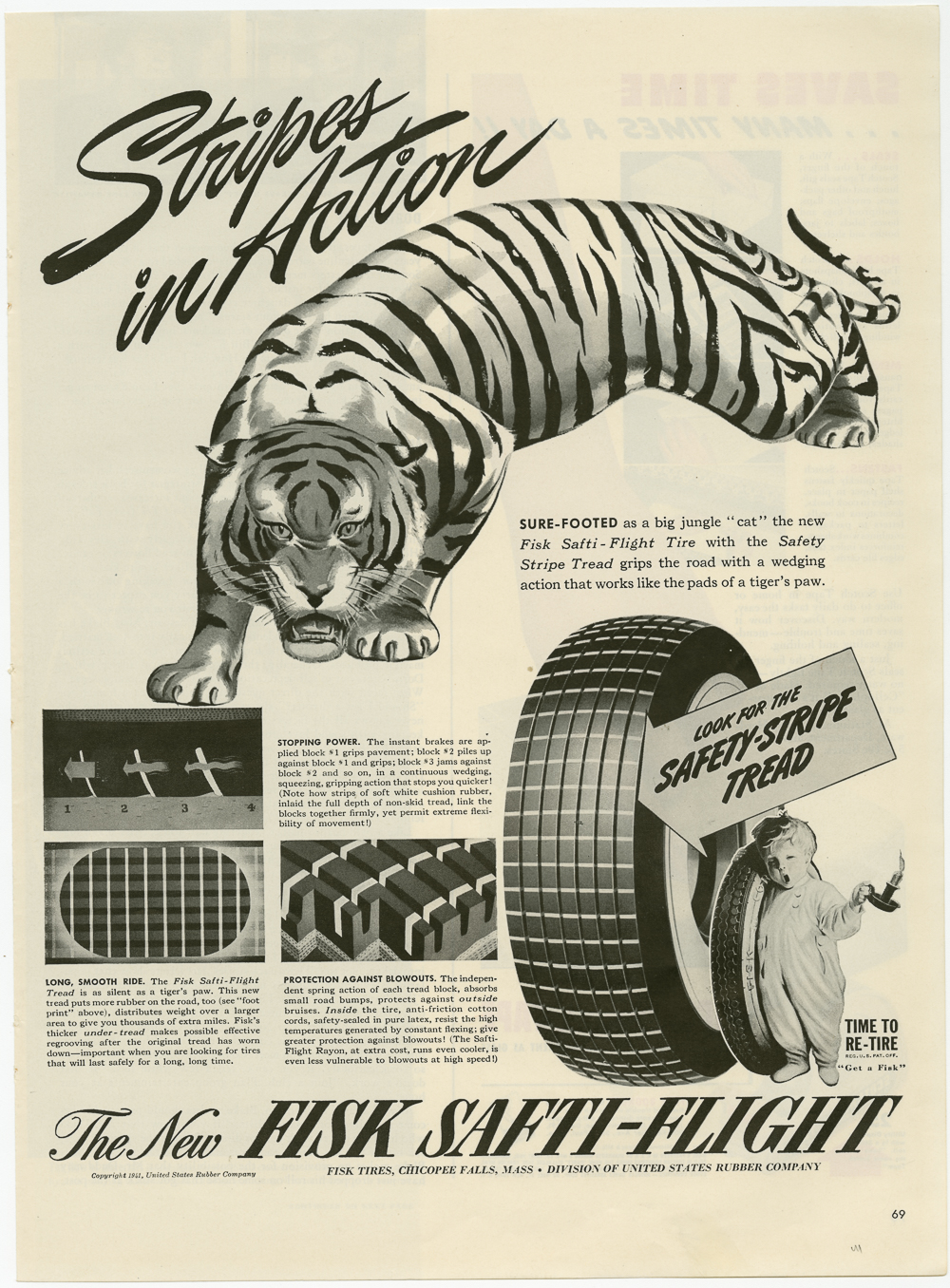 Fisk Tire Company print ad featuring a large tiger at the top of the page with boxes and art describing the Safety-Stripe tire.