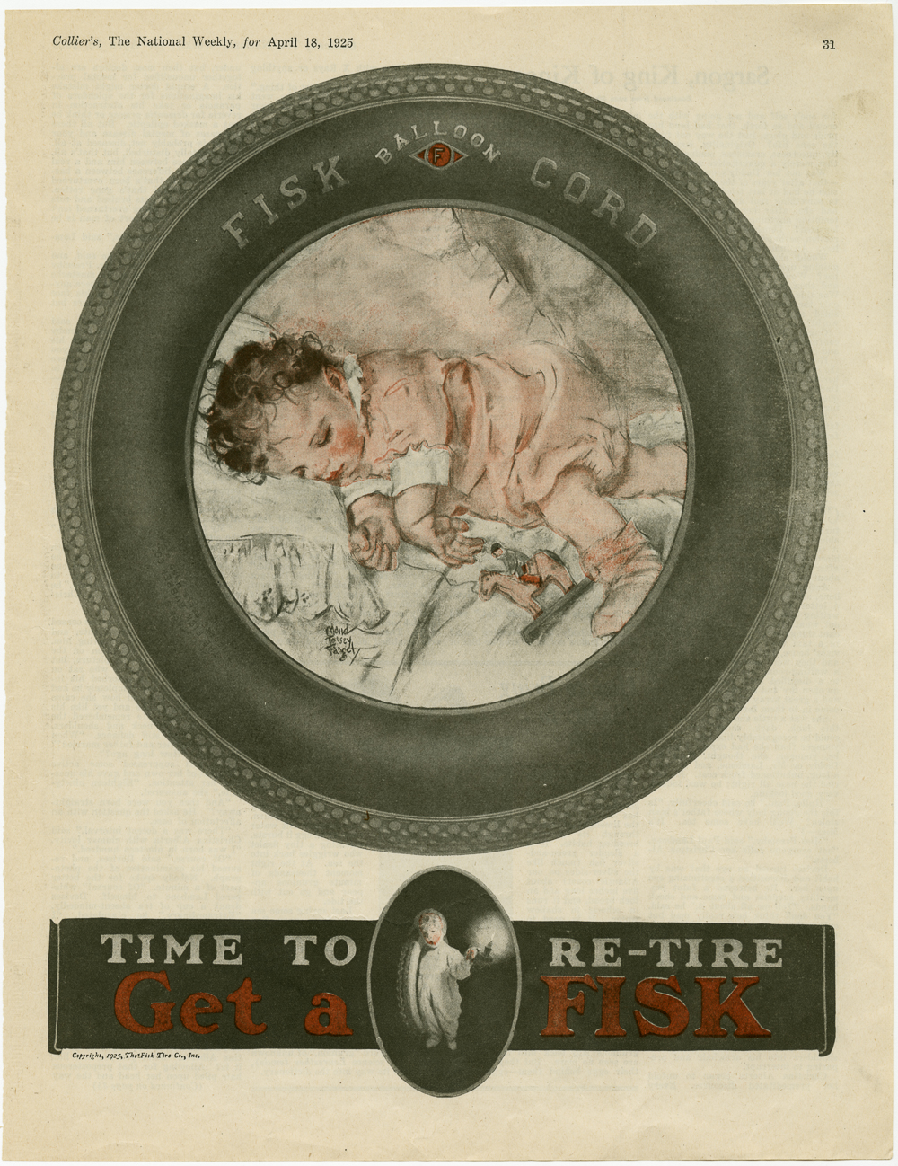 Fisk Tire Company print ad with a large fisk tire on the page with the image of a sleeping child in the center. Fisk logo is at the bottom of the page.