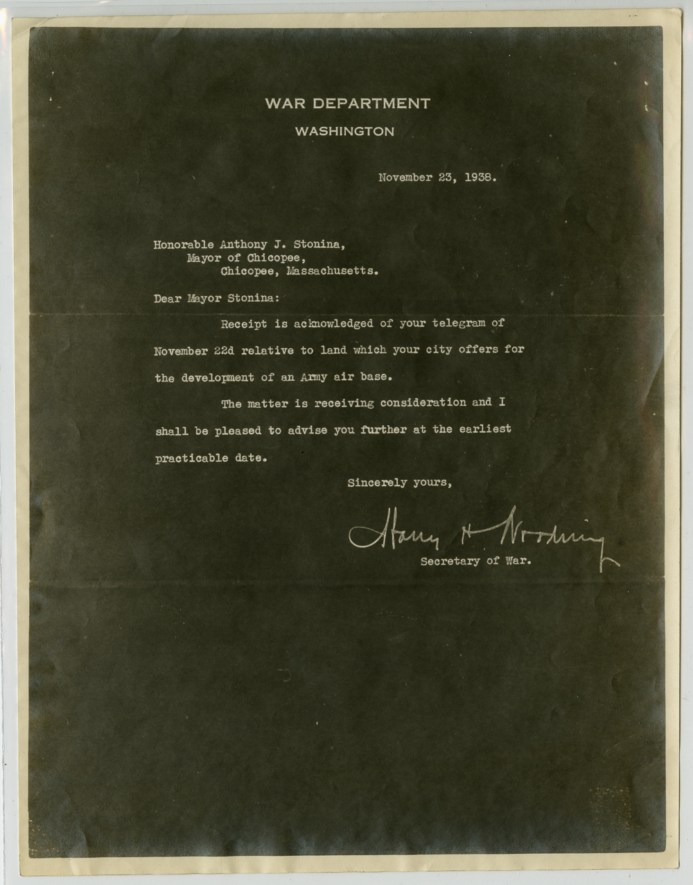 Series of 23 correspondences, mostly to Anthony J. Stonina, from various officials in Washington D.C. concerning the possible selection of Chicopee as the site for the Northeastern Army Air Corps base.