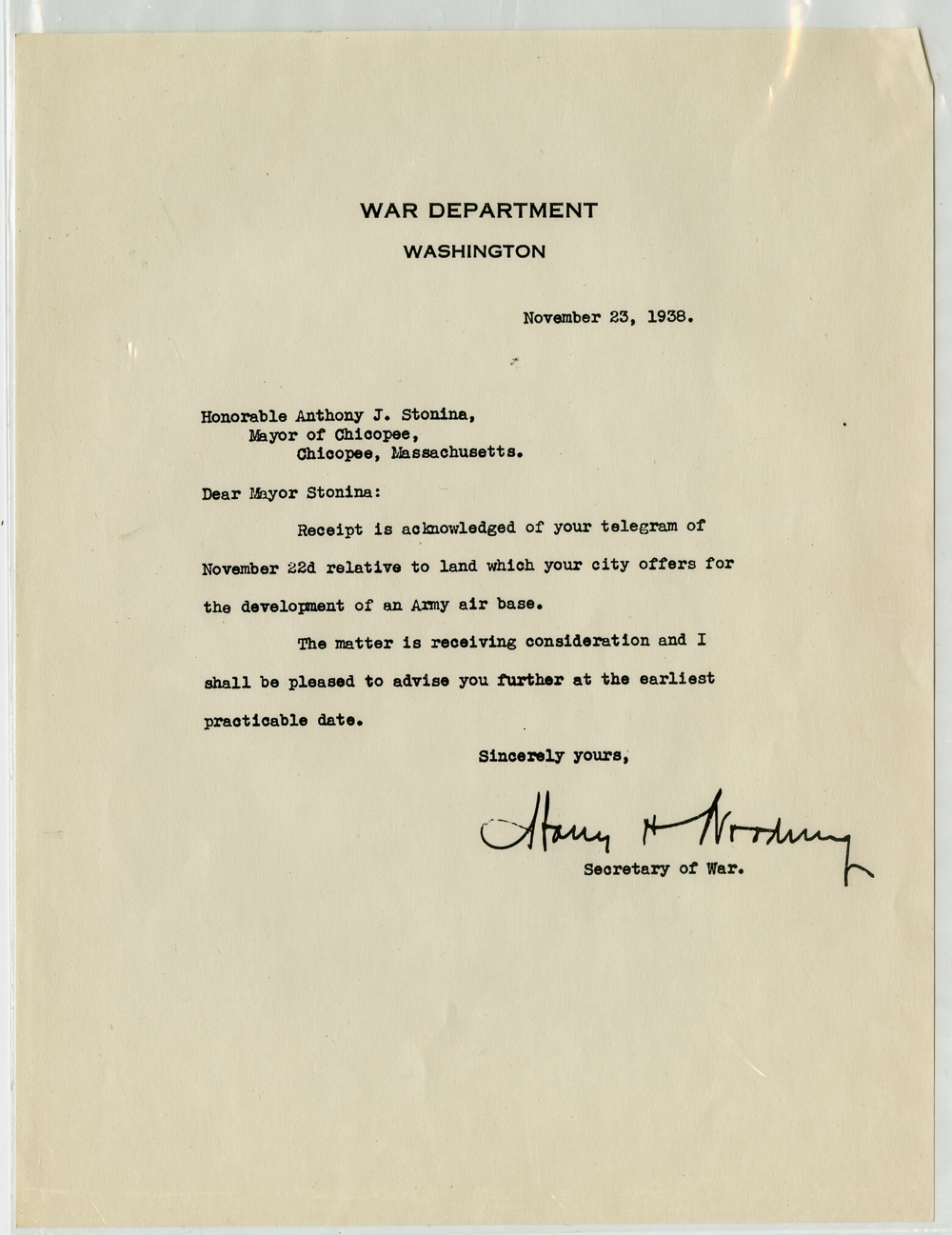 Series of 23 correspondences, mostly to Anthony J. Stonina, from various officials in Washington D.C. concerning the possible selection of Chicopee as the site for the Northeastern Army Air Corps base.
