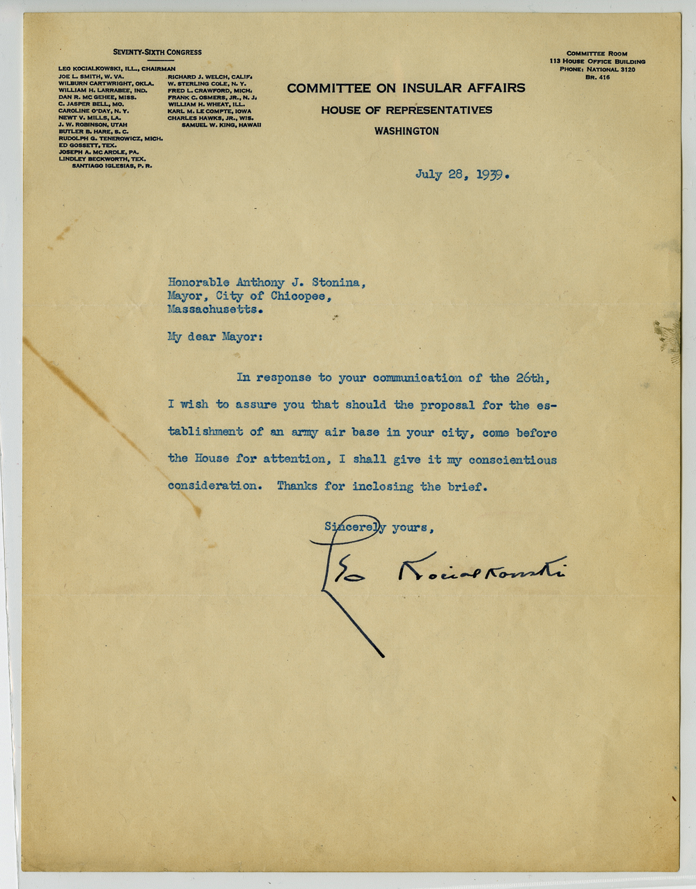 Series of 23 correspondences, mostly to Anthony J. Stonina, from various officials in Washington D.C. concerning the possible selection of Chicopee as the site for the Northeastern Army Air Corps base.
