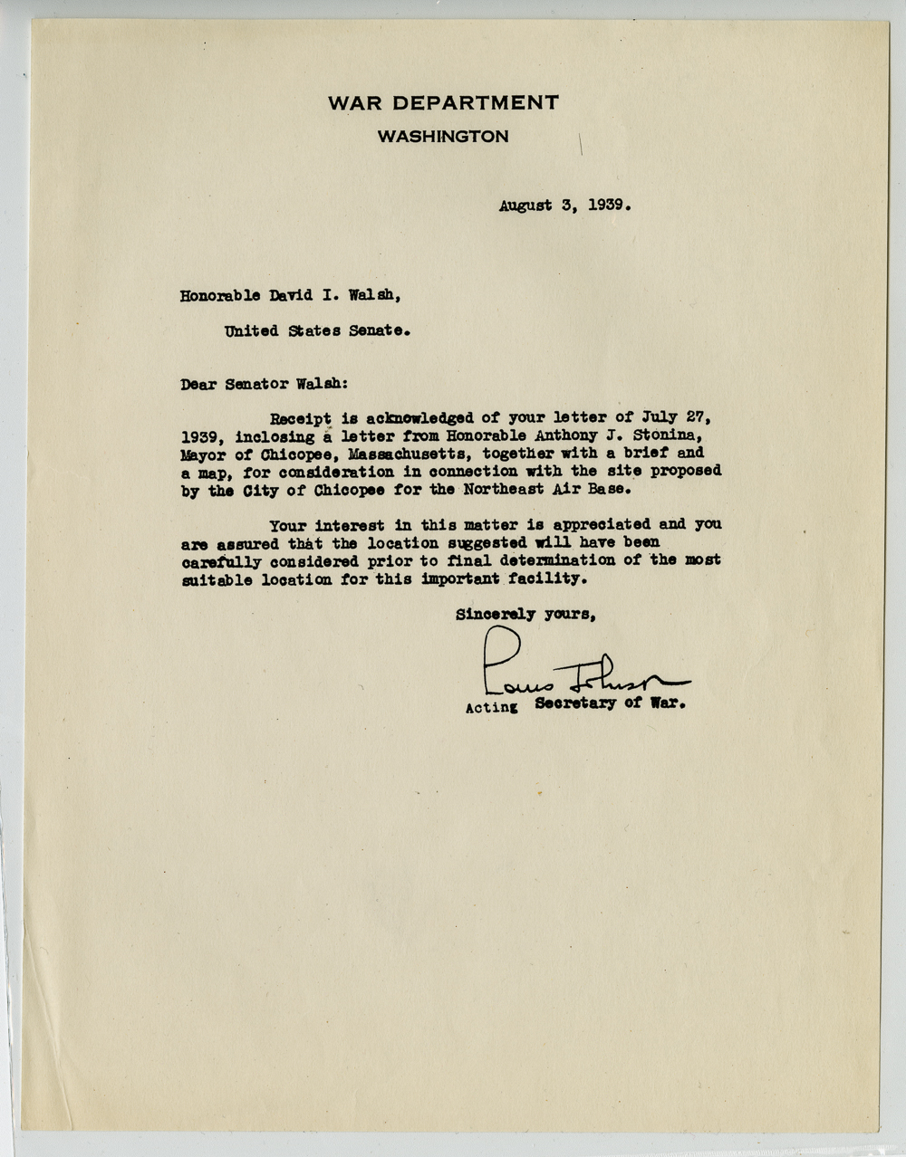 Series of 23 correspondences, mostly to Anthony J. Stonina, from various officials in Washington D.C. concerning the possible selection of Chicopee as the site for the Northeastern Army Air Corps base.