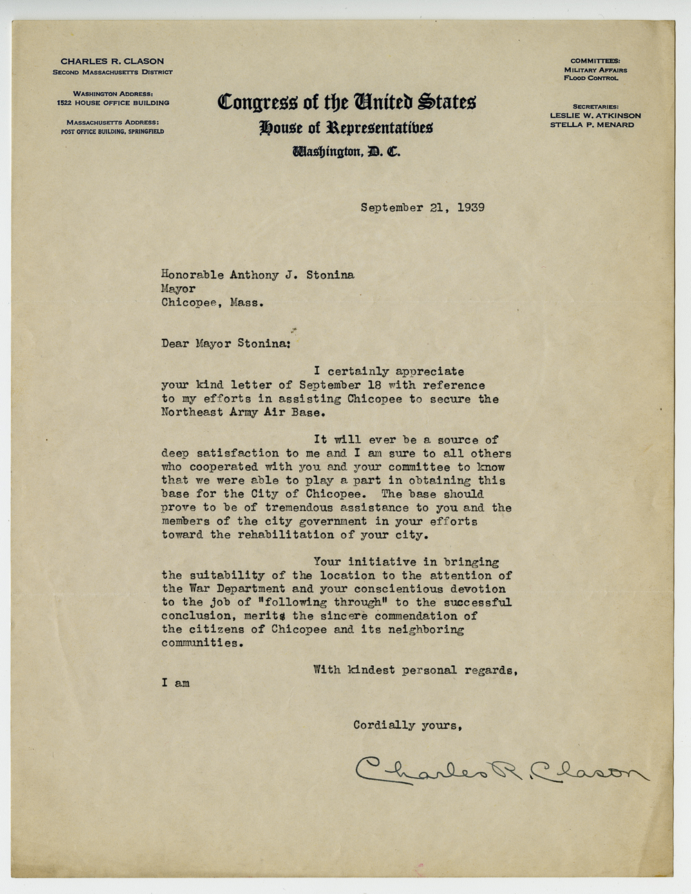 Series of 23 correspondences, mostly to Anthony J. Stonina, from various officials in Washington D.C. concerning the possible selection of Chicopee as the site for the Northeastern Army Air Corps base.