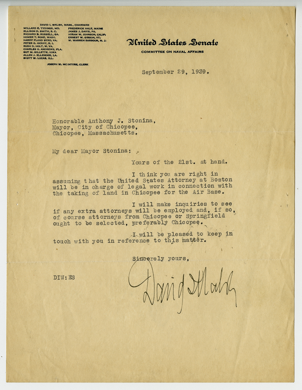 Series of 23 correspondences, mostly to Anthony J. Stonina, from various officials in Washington D.C. concerning the possible selection of Chicopee as the site for the Northeastern Army Air Corps base.