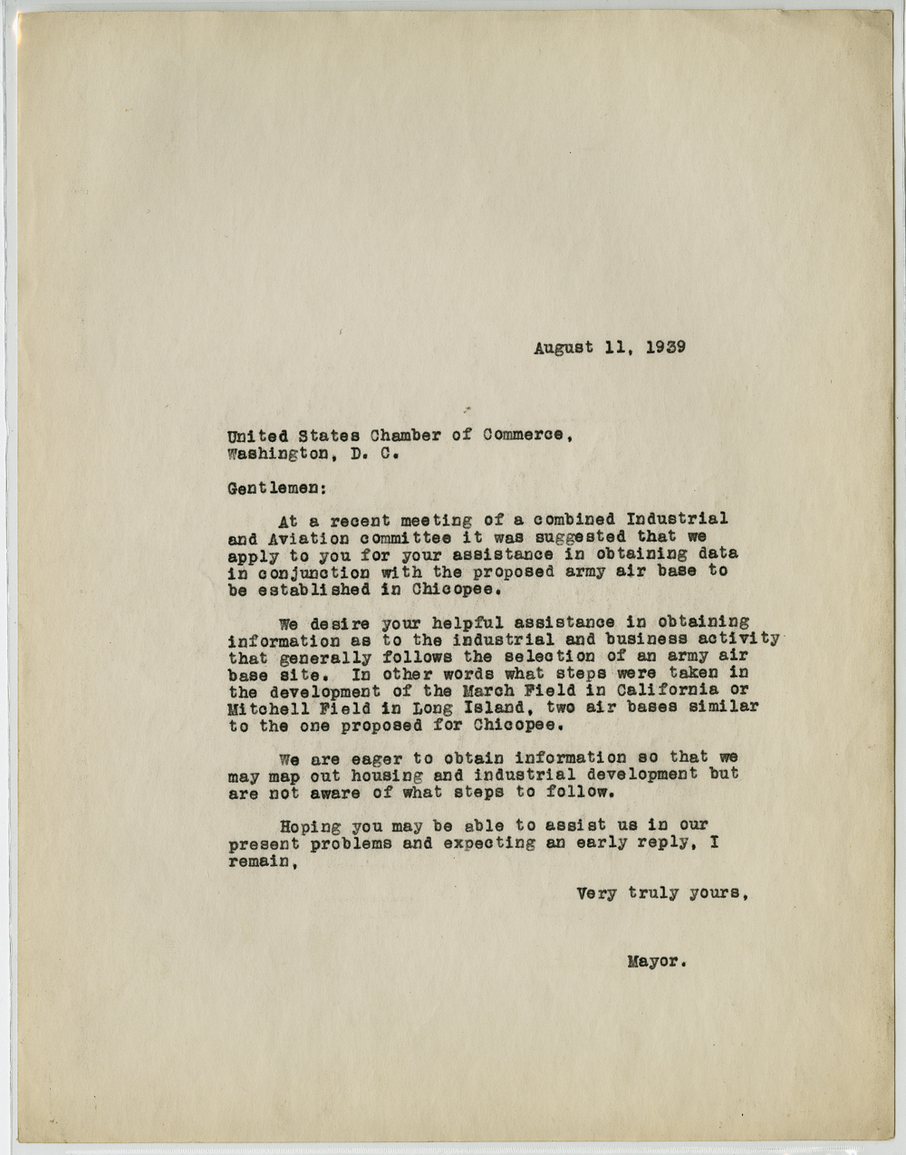 Correspondence between Anthony J Stonina and various other civic and business leaders in relation to the establishment of Westover Airbase.