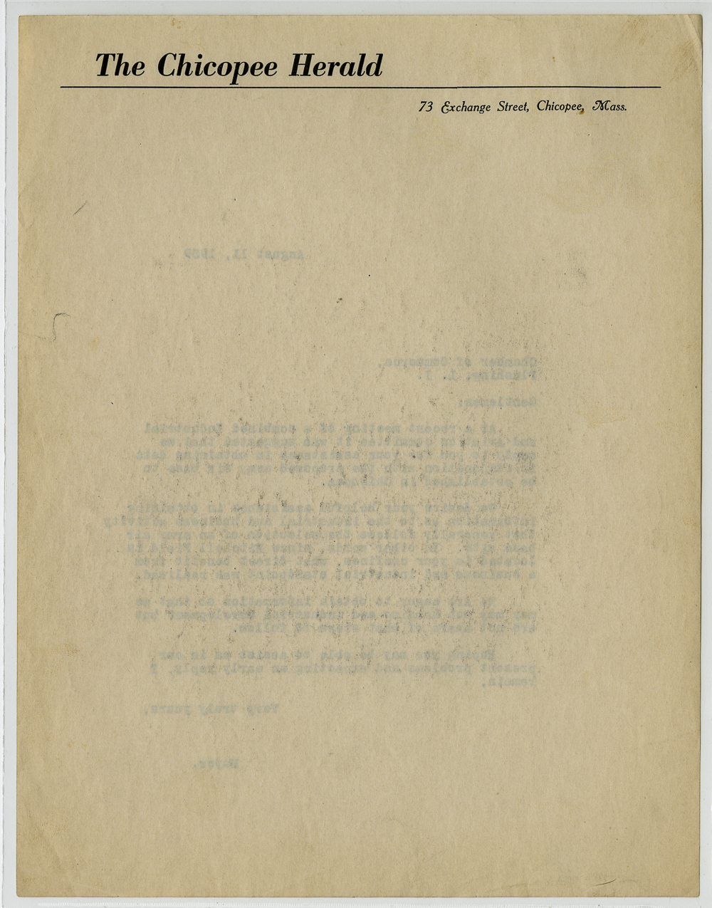 Correspondence between Anthony J Stonina and various other civic and business leaders in relation to the establishment of Westover Airbase.