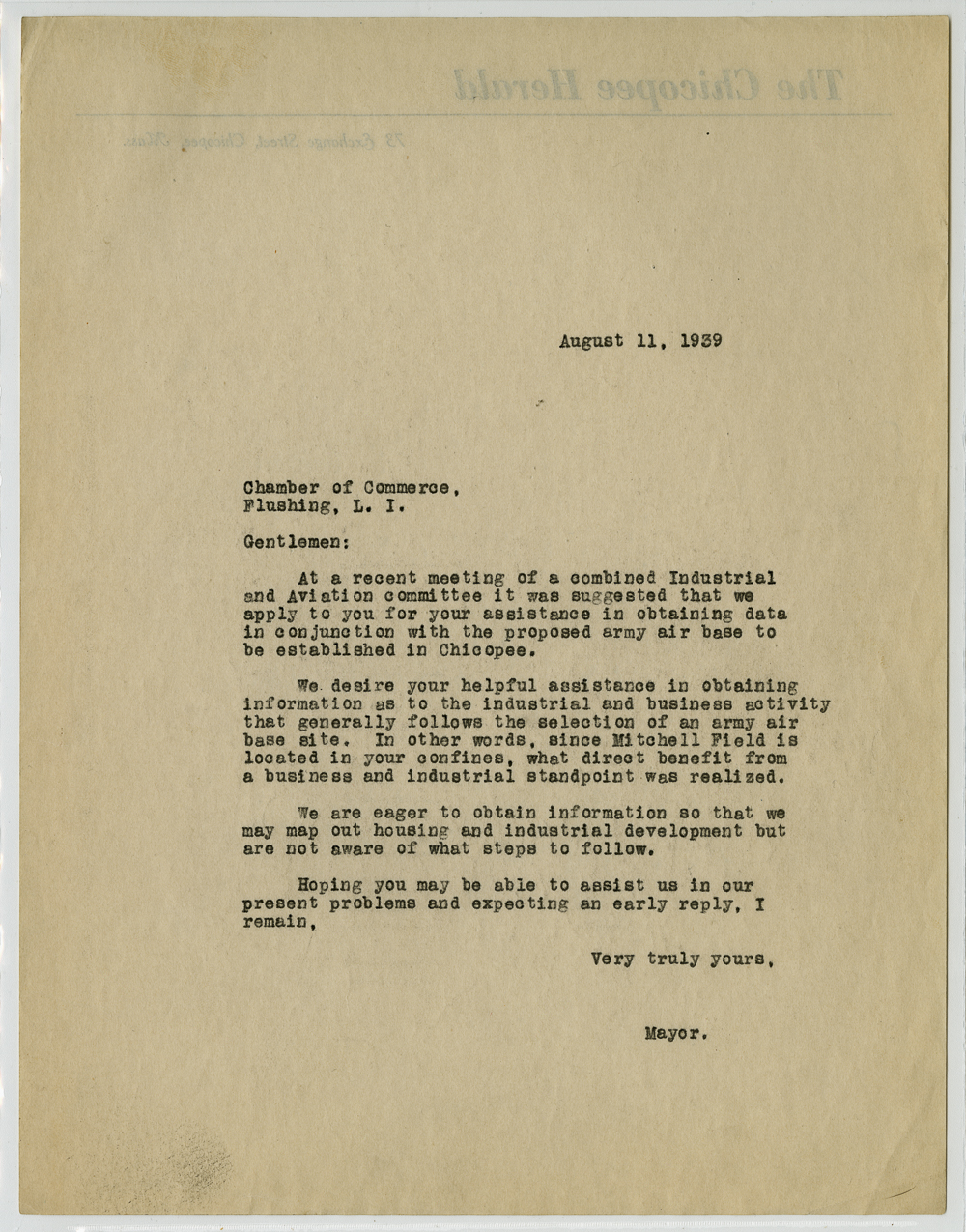 “Other Correspondence Concerning Westover Air Base,” Chicopee Archives Online, accessed March 5, 2026, https://www.chicopeepubliclibrary.org/archives/items/show/5686.