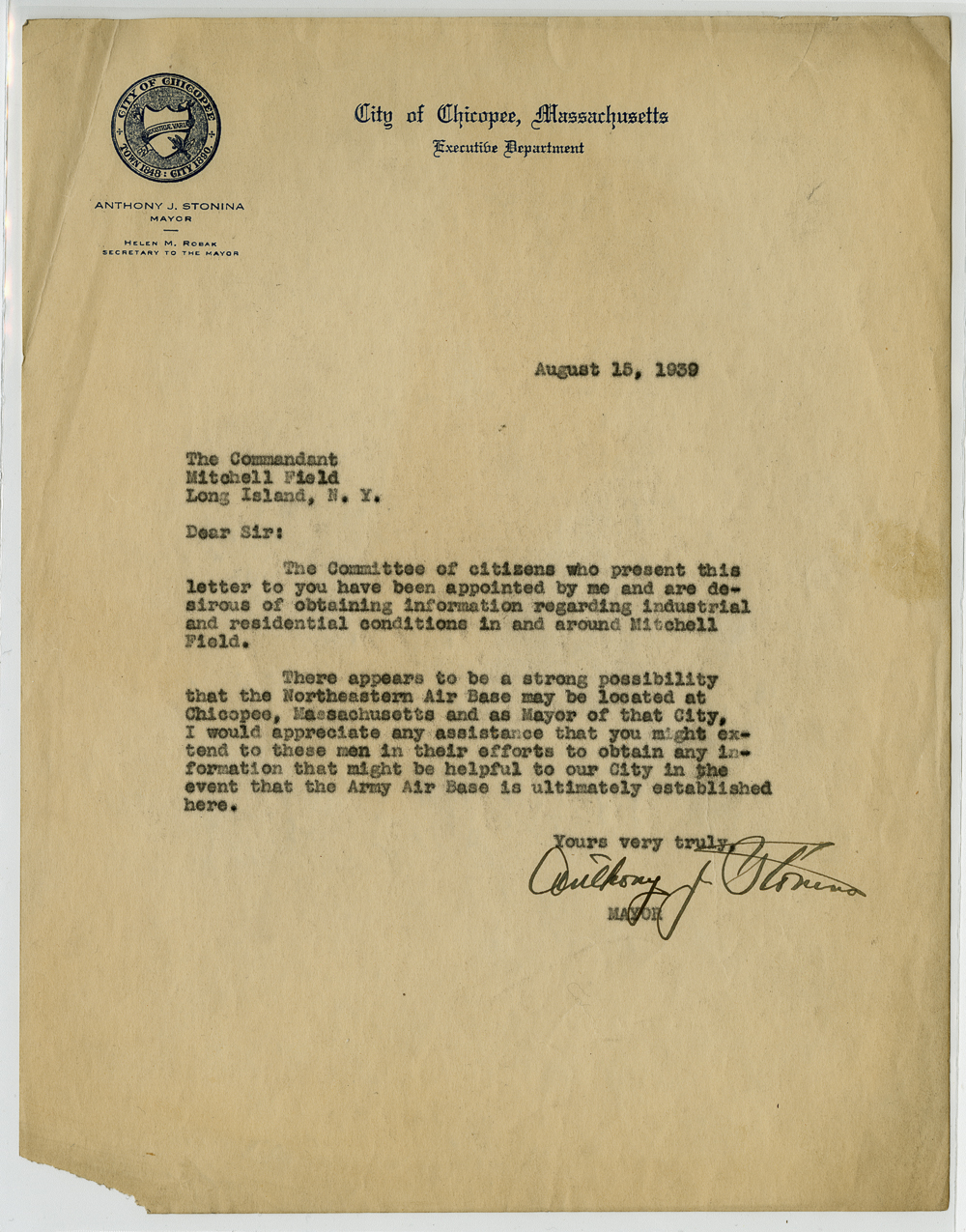 Correspondence between Anthony J Stonina and various other civic and business leaders in relation to the establishment of Westover Airbase.