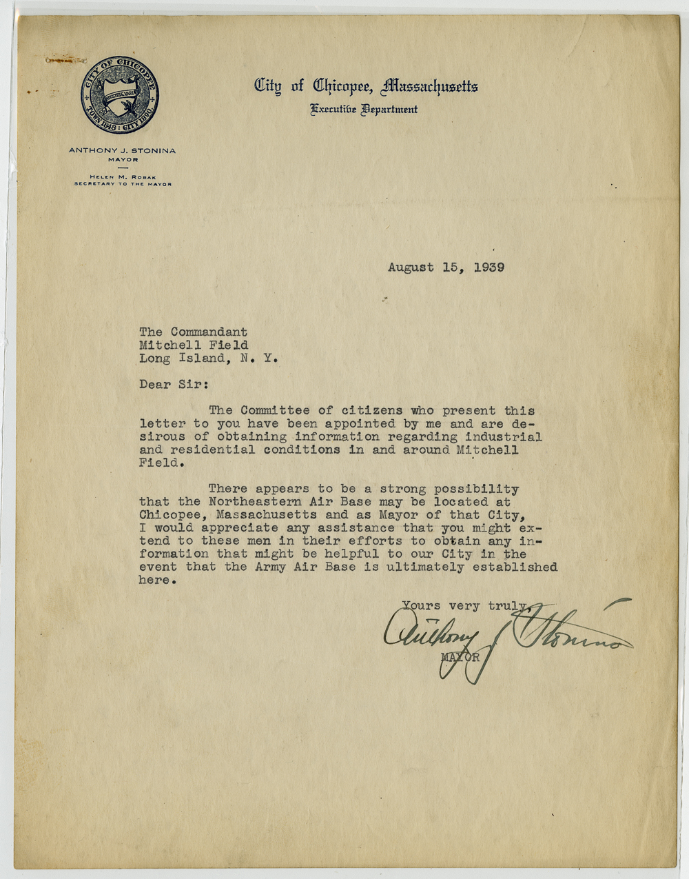 Correspondence between Anthony J Stonina and various other civic and business leaders in relation to the establishment of Westover Airbase.