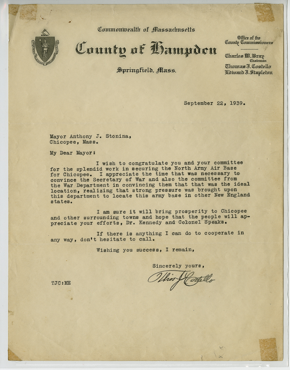 Correspondence between Anthony J Stonina and various other civic and business leaders in relation to the establishment of Westover Airbase.
