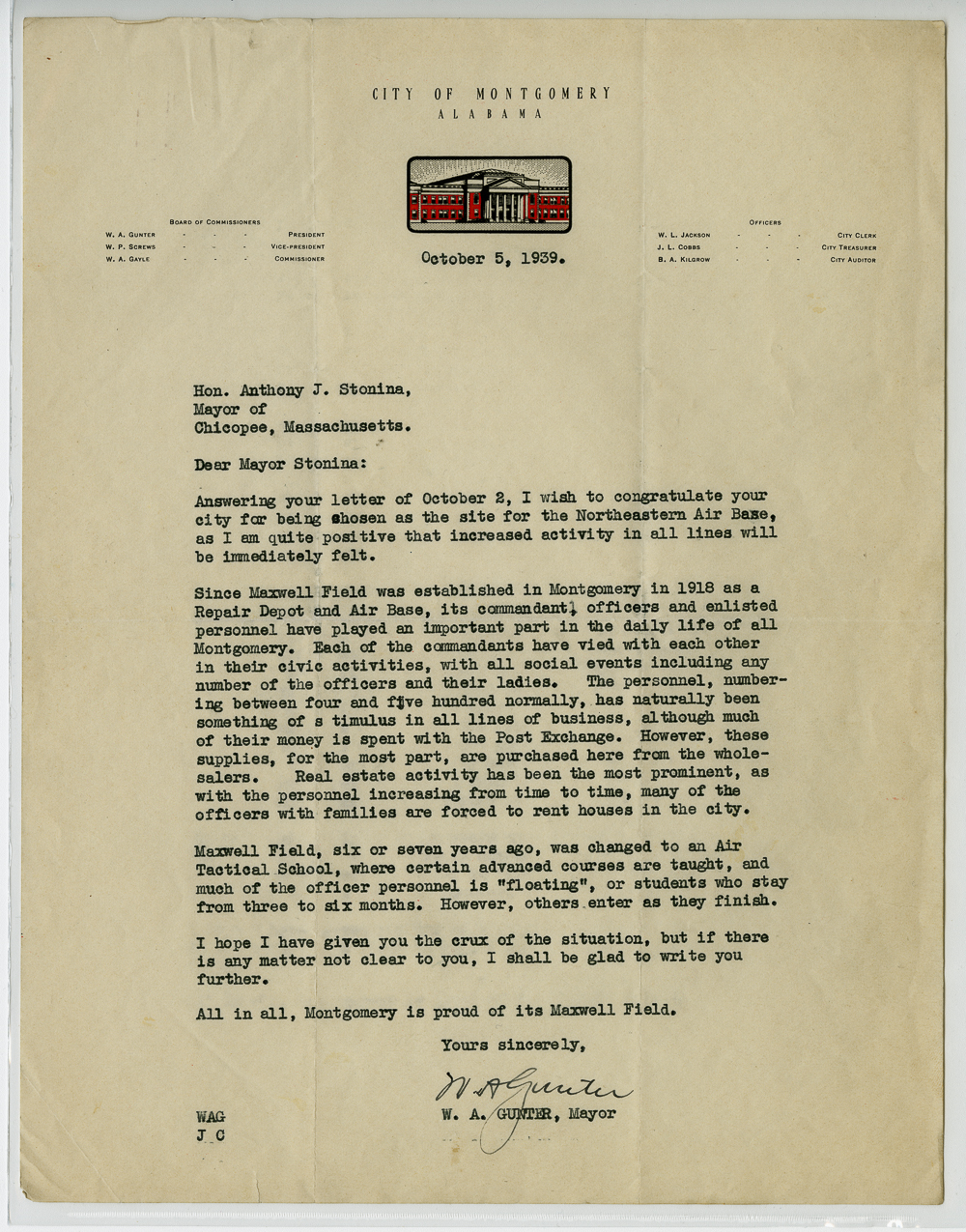 Correspondence between Anthony J Stonina and various other civic and business leaders in relation to the establishment of Westover Airbase.
