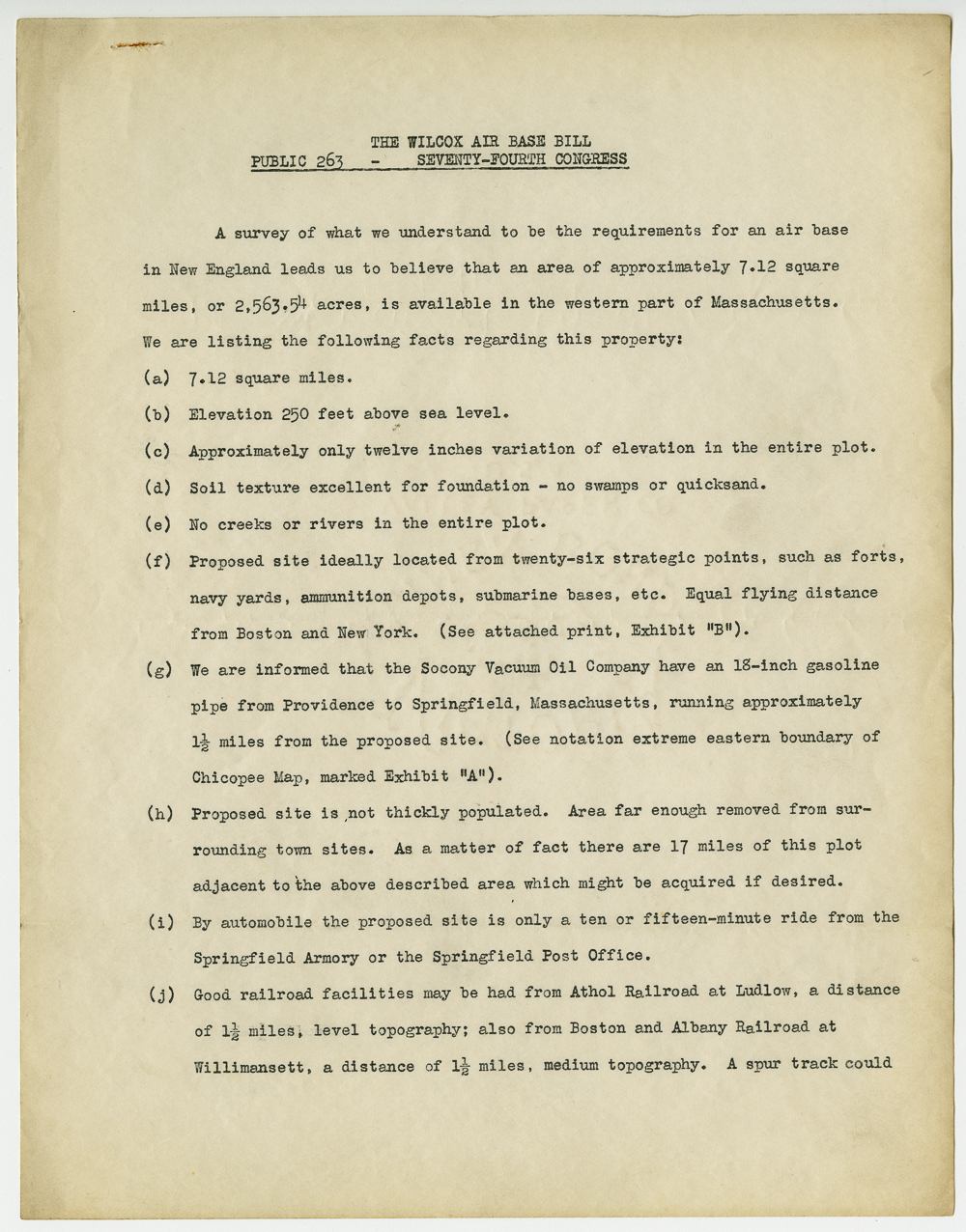 Items relating to Westover Air Reserve Base. A copy of the Wilcox Air Base Bill from the Seventy-Fourth Congress.