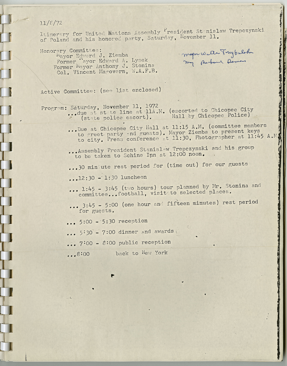 Materials Related to the Visit of the UN General Assembly President Stanislaw Trepczynski to Chicopee, MA