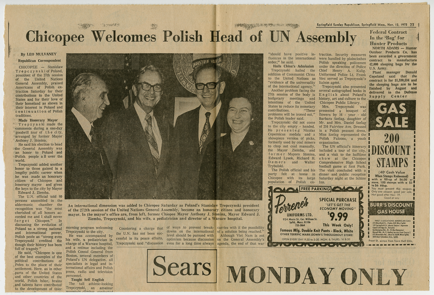 Materials Related to the Visit of the UN General Assembly President Stanislaw Trepczynski to Chicopee, MA