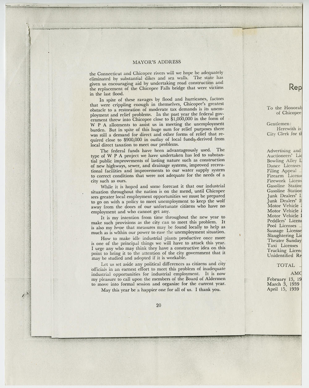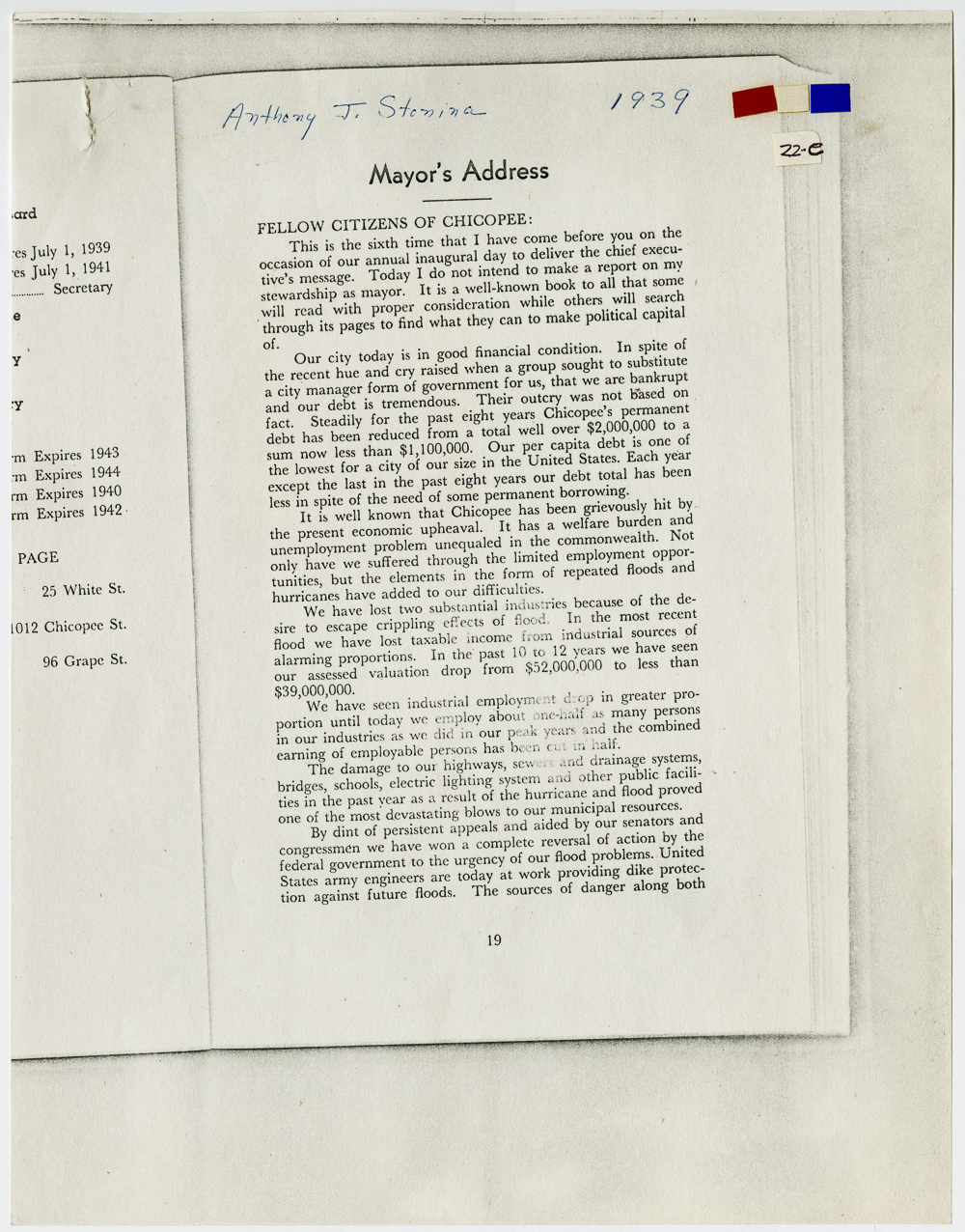 Miscellaneous materials related to the city of Chicopee and its former mayor, Anthony Stonina. Mayor's address for 1939.